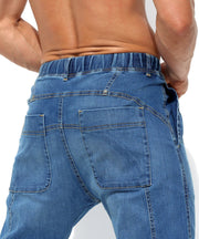 A slim-fit straight leg stretch denim jean with an entirely new construction and a light "sun kissed" distressed finish. Designed with a comfy enclosed elastic waistband geared with an adjustable raised rubber logo drawcord, featuring side slant and back patch pockets, RUFSKIN's signature vertical back seam, a back yoke to highlight the rear and a slightly relaxed crotch for added comfort and ease of motion.