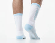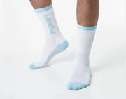 A fresh option for your sock drawer. PUMP!’s Frost Crew Socks are designed for comfort and functionality. They feature a ribbed leg that gives you a secure fit, terry knit cushioning, and a sky blue, white, and mélange gray striped sole with contrasting details for a modern look.