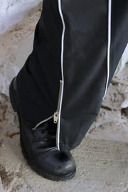 This fresh take on the track pant, features a wide leg with expandable ankle zippers and soft nylon and rubberized fabrics that give the impression of a modern-day chap.